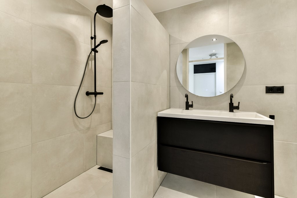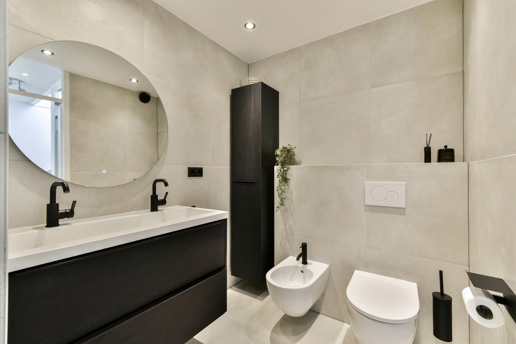 First floor: three well-sized bedrooms and a modern, fully tiled bathroom with bathtub, separate shower and bidet, second toilet, and a vanity unit.