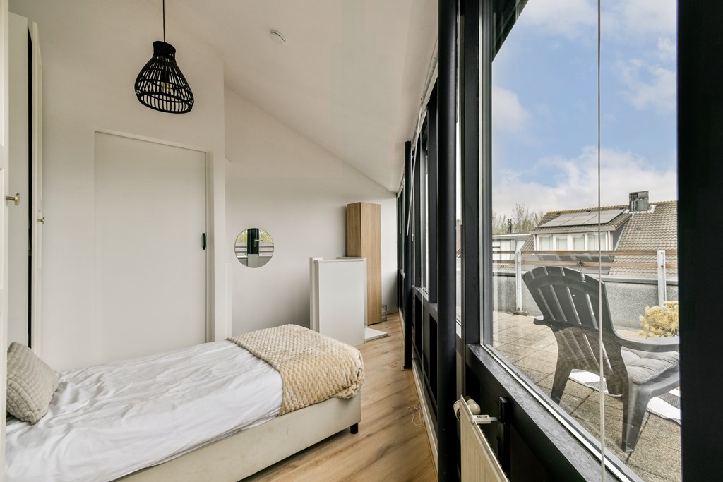 Tweede verdieping: een royale vierde kamer met toegang tot het dakterras, wasruimte en cv-opstelling.